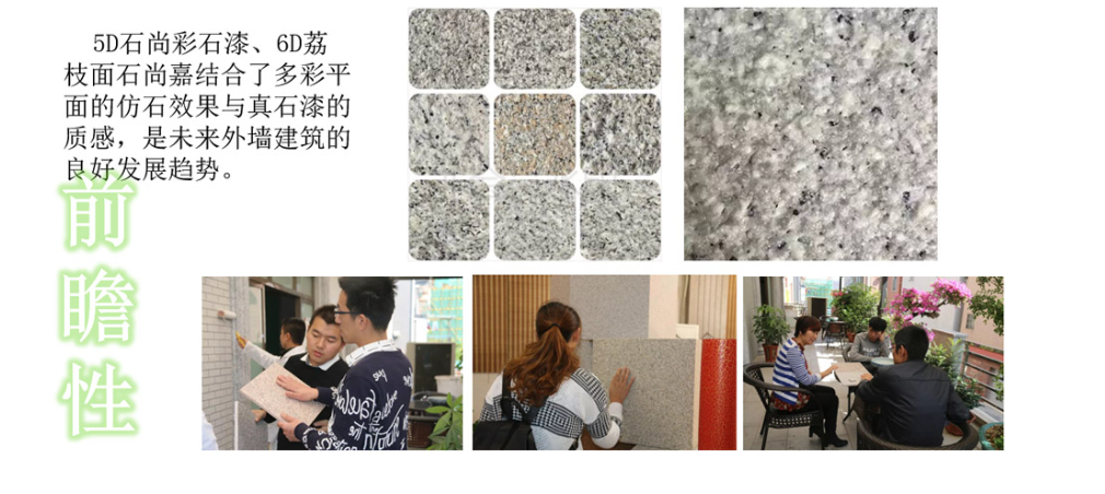 5D石尚彩石漆、6D荔枝面石尚嘉結(jié)合了多彩平面的仿石效果與真石漆的質(zhì)感,是未來外墻建筑的良好發(fā)展趨勢(shì)。