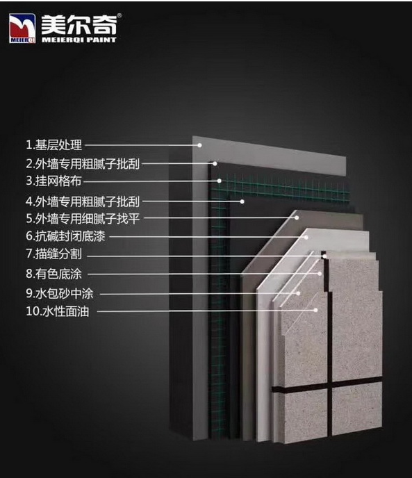 基層處理→外墻專用粗膩?zhàn)优?rarr;掛網(wǎng)格布→外墻專用粗膩?zhàn)优?rarr;外墻專用細(xì)膩?zhàn)诱移?rarr;抗堿封閉底漆→描縫分割→有色底涂→水包砂中涂→水性面油