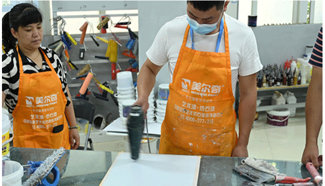 漆匠師傅通過勤奮學習,不僅提升了仿石漆與藝術(shù)漆的施工工藝也了解到美爾奇仿石漆與